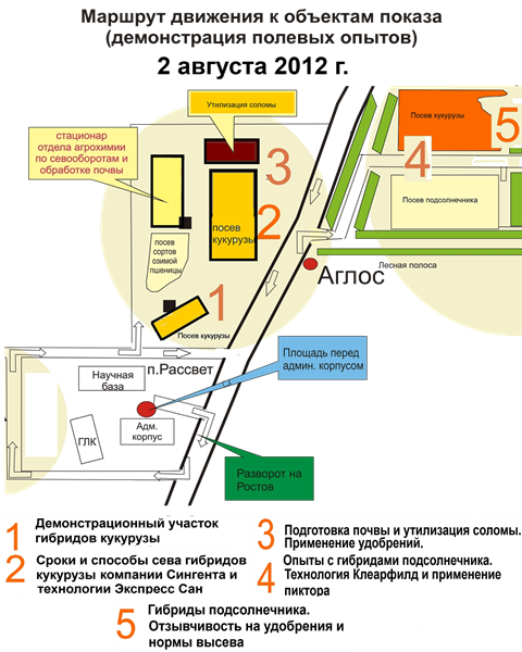 ПРОГРАММА 9.00-10.00 - Заезд участников, регистрация 10.00-10.10 – Переезд на поле отдела агрохимии и защиты растений 10.10-11.30 – Полевой показ гибридов кукурузы (сроки сева, нормы высева, отзывчивость на удобрения). Технология Express-san на подсолнечнике. (объекты показа и маршрут - приложение 1, 2). 11.30-12.00 – Подготовка почвы под озимые культуры и способы утилизации побочной продукции. (объекты показа и маршрут - приложение 3). 12.00-12.20 – Переезд на поле отдела агрохимии и защиты растений 12.20 – 13.40 – Полевой показ сортов и гибридов подсолнечника (технология Clearfield). Отзывчивость на удобрения, нормы высева, эффективность применения фунгицидов и протравителей (объекты показа и маршрут - приложение 4, 5).